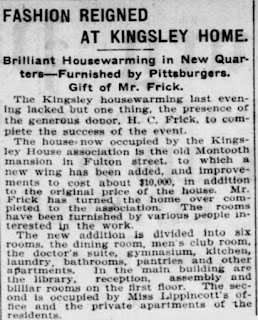 [ii] A blurb in the 3 November 1901 Pittsburgh Press indicated that Kingsley House was “looking forward to the prospect” of Rev. Hodges and Mr. and Mrs. Frick attending the reception. But Reverend Hodges was Dean of Episcopal Theological School in Cambridge, Massachusetts and was unable to attend, although he sent a telegram of congratulations to be read aloud at the event. It is not known why the Fricks didn’t attend. It’s possible that a previous commitment or travel plans took precedence. Perhaps the terminal illness and death of his uncle Jacob Frick in Wooster Ohio that same week served as a social excuse. In general, it seems that HCF did not seek the public approbation for his good deeds with the same enthusiasm as did his former colleague Andrew Carnegie. Also, given Frick’s focus on travel and work in NYC at the turn of the century, the goings-on in Pittsburgh were perhaps less important than they once were. And it is quite possible that the organization itself became less of a priority as it shifted to a more activist reformist stance. Kingsley Association and the surrounding area served as ground zero for the scathing, widely-publicized Pittsburgh Survey, a ground-breaking sociological study of urban poverty and industry. Although always listed as 'lifetime members’ in recognition of their initial generosity, Frick and his family members were not listed as repeat donors in Kingsley Association annual reports.